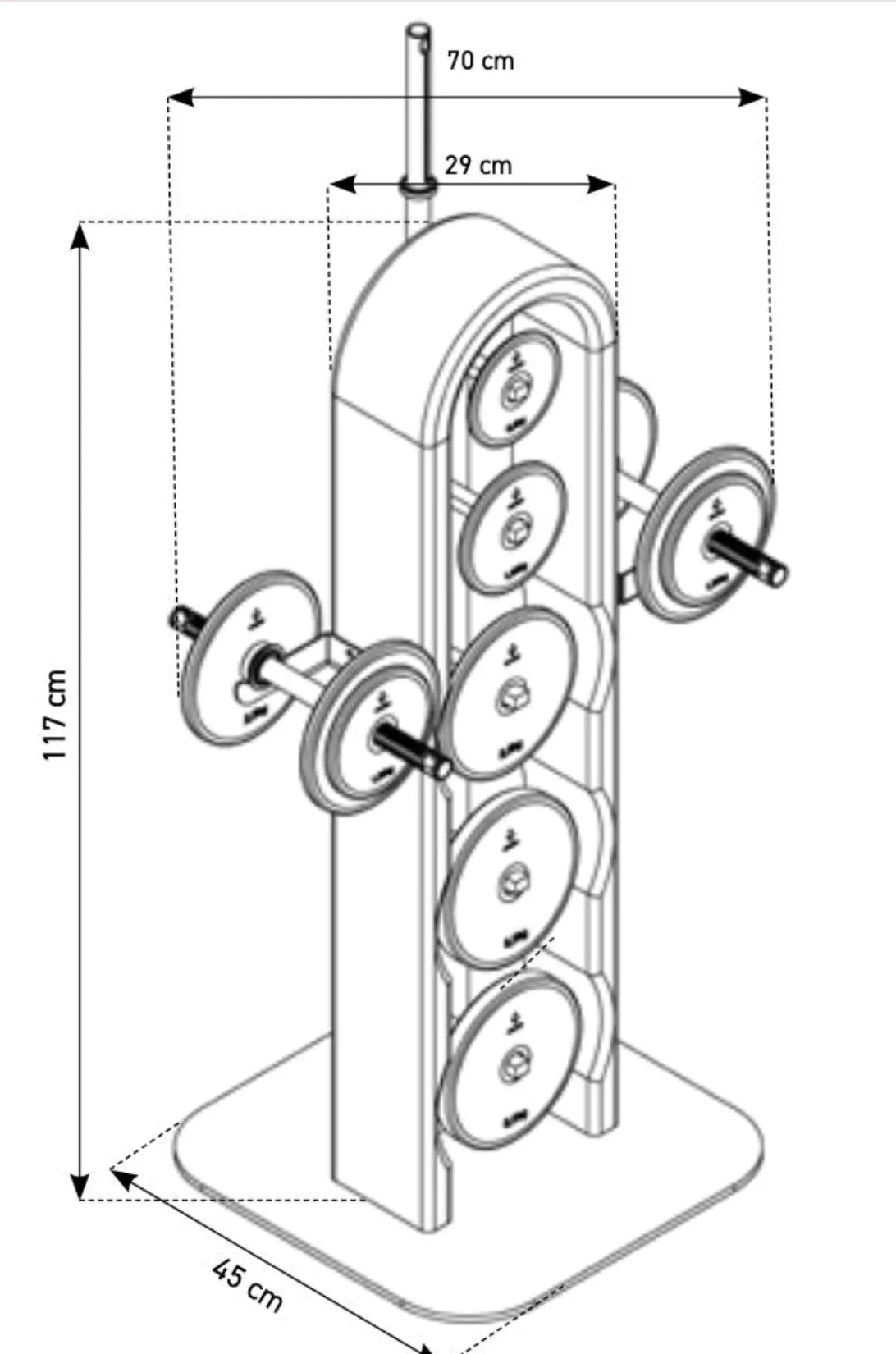 Stabiele gewichtentoren van massief, geolied hout met in totaal 20 halterschijven (8 x 5 kg, 4 x 2,5 kg, 4 x 1,25 kg, 4 x 0,5 kg).